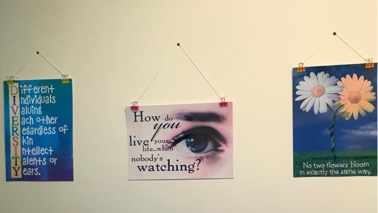 The walls have been painted and adorned with thought provoking posters. The chair seats have been recovered in a tasteful fabric and dressed with matching cushions and throws.